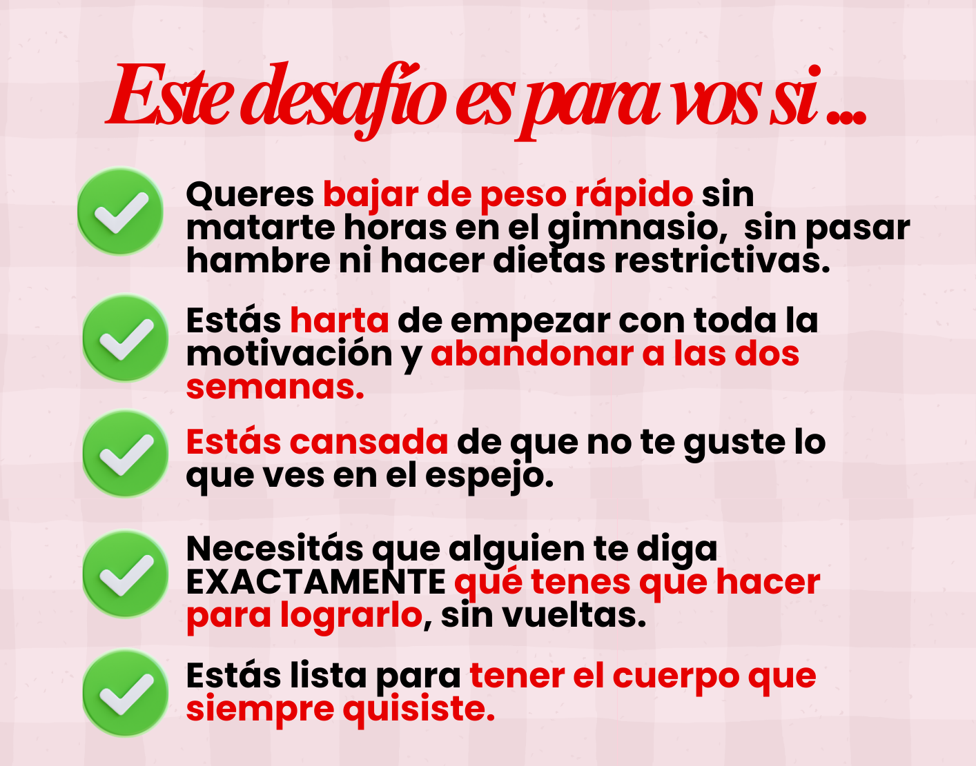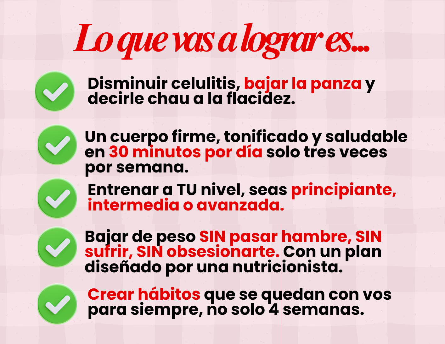 Sí, si seguís el plan. No te prometo un cambio imposible en 30 días. Lo que SÍ te prometo es que si aplicás las rutinas y seguís las guías de alimentación, vas a ver cambios reales: ropa que te queda distinto, más energía, menos hinchazón y un cuerpo más firme. Los resultados dependen de tu constancia, pero el método está probado por +8.000 mujeres.